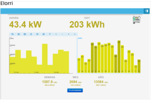 El autoconsumo lo estamos realizando desde dos Instalaciones Fotovoltaicas: IFV El Lago/Mendigoiti y la IFV Elorri. La primera es propiedad del Ayuntamiento de Pamplona que nos cede el 80% de la energía producida y la segunda es propiedad nuestra si bien cedemos al Ayuntamiento de Pamplona 5kwp por la cesión de la cubierta. En total disponemos de 175 kwp: 80 kwp en El Lago/Mendigoiti y 95 en Elorri.